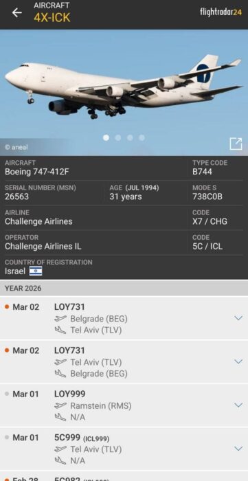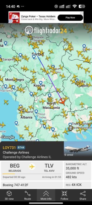 Авион LOY731 (Reg: 4X-ICK, Heks: 738C0B, Boing 747-412F) Challenge Airlines IL полетео је из Тел Авива и слетео у Београд јутрос.