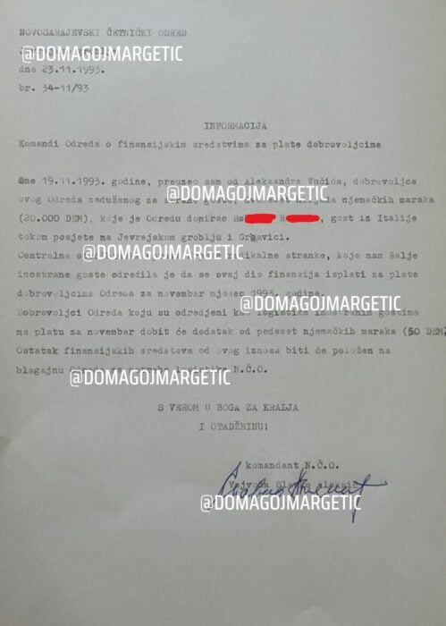 Према Маргетићевим наводима, реч је о „информацији“ написаној и потписаној у новембру 1993. године, коју је саставио Славко Алексић, представљен као командант „Новосарајевског четничког одреда“. Маргетић истиче да се у документу помиње донација у износу од 20.000 немачких марака, коју је, како тврди, извесни италијански гост дао за потребе одреда.
