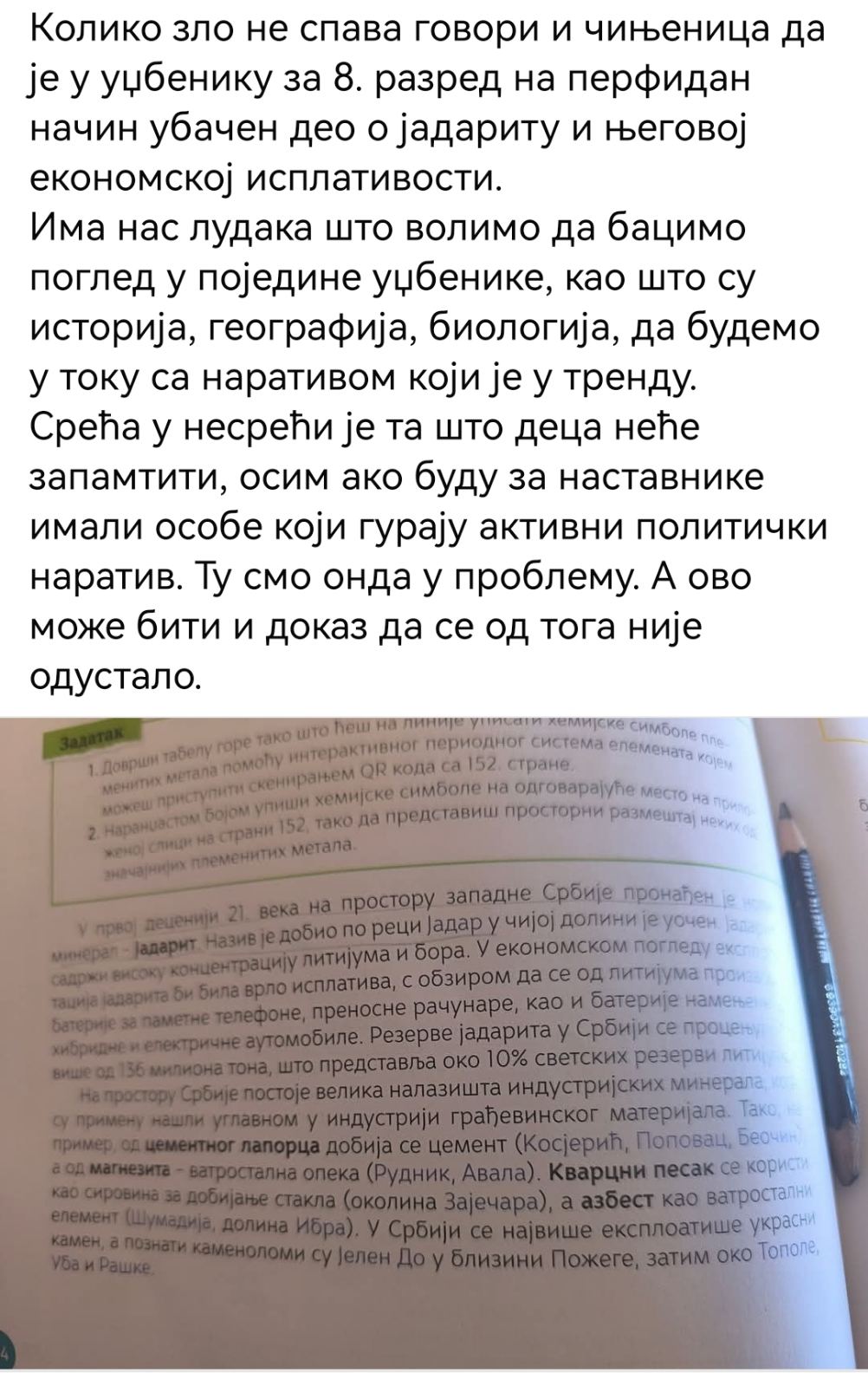 На први поглед све делује као безазлена лекција из природних ресурса. Помиње се јадарит, минерал пронађен у западној Србији, говори се о резервама и економској исплативости. Ученицима се објашњава како се од литијума праве батерије за телефоне, лаптопове и електричне аутомобиле. Све је написано као да је у питању прича о неком технолошком напретку који треба да дочекамо раширених руку.