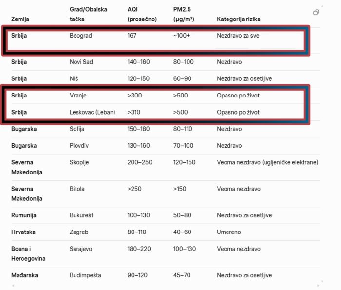 (Подаци базирани на реалним мерењима са https://waqi.info и https://www.iqair.com; за ажурирања, посетите сајт директно. Чланак је написан на основу тренутних извештаја EEA, СЗО, Just Finance International и Balkan Insight.)