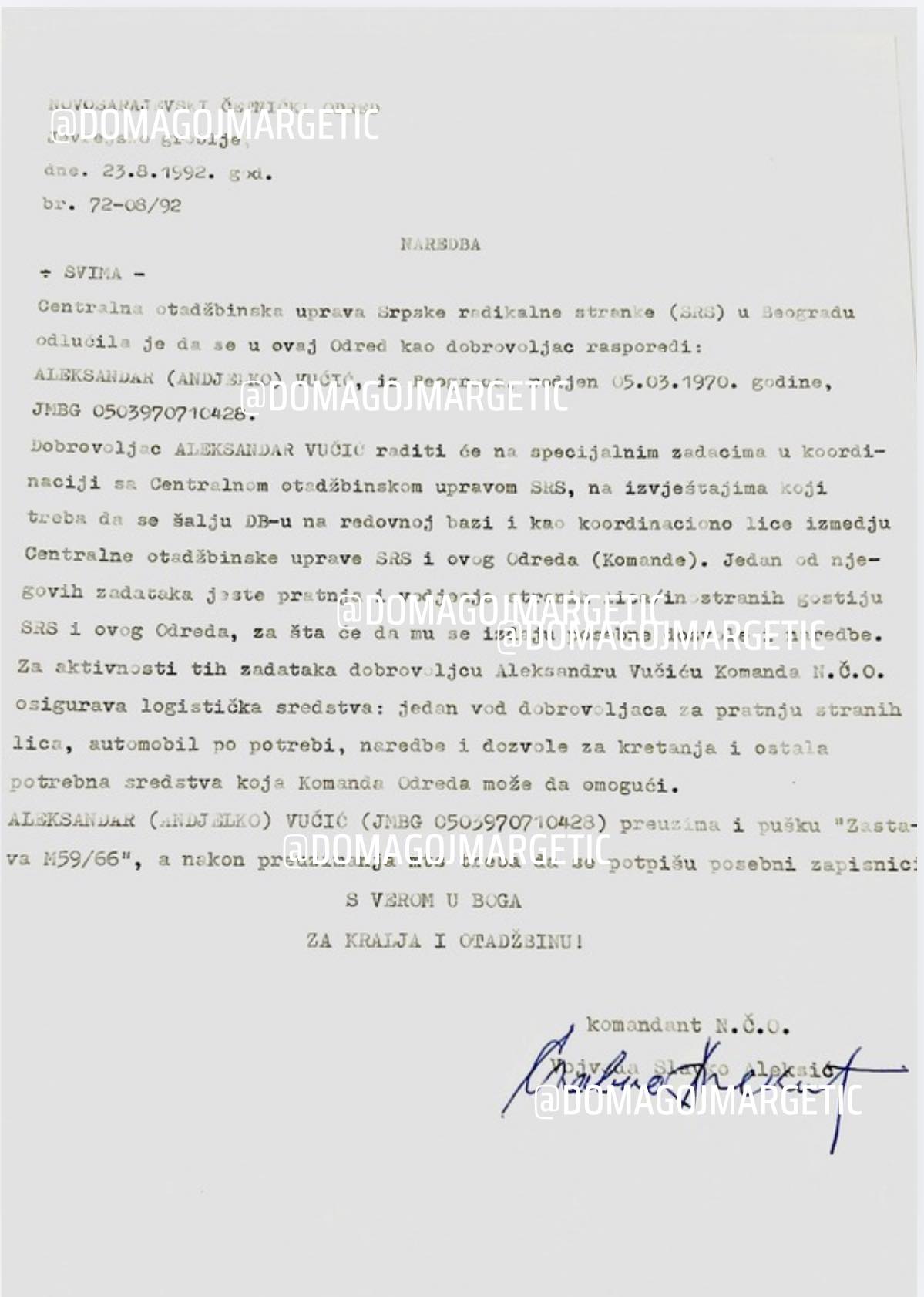 Реч је о документу „Новосарајевског четничког одреда“, под бројем 72-08/92 од 23. августа 1992. године, који потписује командант тог одреда Славко Алексић. Према садржају наредбе, Александар Вучић је као добровољац распоређен на специјалне задатке у координацији са Централном отаџбинском управом Српске радикалне странке, уз обавезу редовног извештавања ДБ-а.