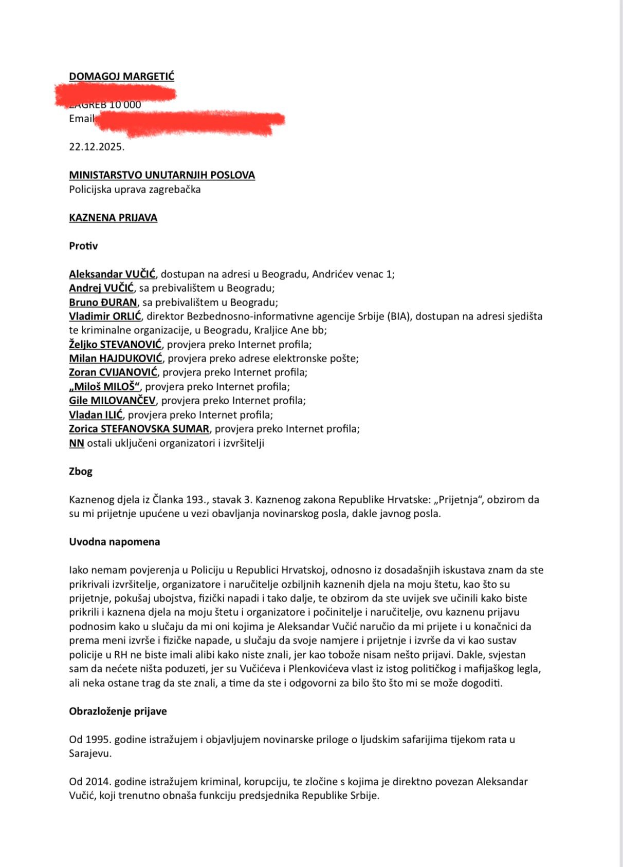 Istraživački novinar Domagoj Stefan Margetić saopštio je da je Ministarstvu unutrašnjih poslova Republike Hrvatske podneo krivičnu prijavu zbog, kako navodi, ozbiljnih i kontinuiranih pretnji koje prima nakon objavljivanja istraživanja u kojima se pominje predsednik Srbije Aleksandar Vučić.