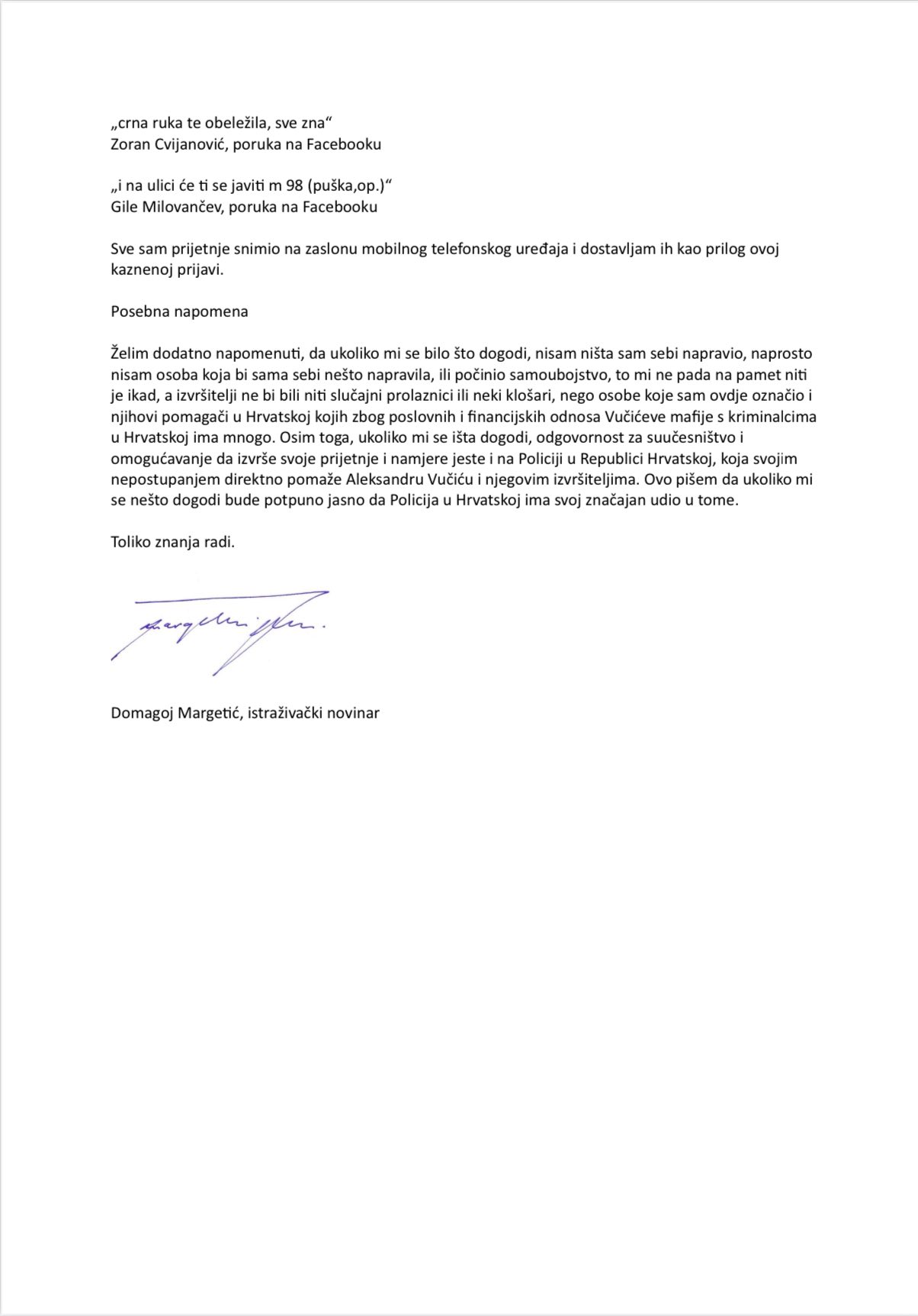Новинар је навео да је део претњи документовао и доставио полицији као прилог кривичној пријави, уз посебну напомену да, уколико му се било шта догоди, то не може бити окарактерисано као несрећан случај или самоповређивање.