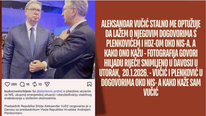 Aleksandar Vučić kaže da Domagoj Margetić „laže“. A onda se pojavi fotografija, i cela priča odjednom postane jednostavna, jasna i neprijatna.Margetić je objavio snimak i fotografiju iz Davosa, uz tvrdnju da je u utorak, 20. januara 2026. godine, došlo do razgovora Aleksandra Vučića i Andreja Plenkovića oko NIS-a, odnosno oko pitanja energetike i vlasničkih dogovora koji se tiču Srbije. U objavi se navodi da Vučić „stalno optužuje“ Margetića da laže o njegovim dogovorima sa Plenkovićem i HDZ-om, ali da, kako kaže, „fotografija govori hiljadu reči“.