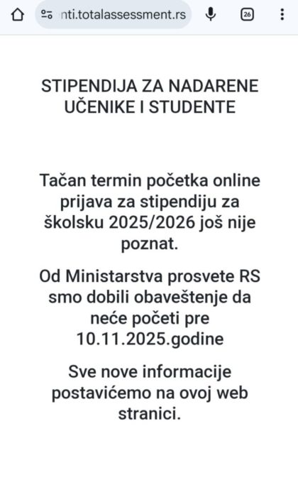 „Министарство просвете не укида стипендије за надарене студенте и свим тренутним корисницима који испуњавају услове за наставак коришћења наведене стипендије, из конкурса, омогућено да је примају у школској 2025/2026.години. Продужетак завршетка академске 2024/2025. године и померање рокова за упис у академску 2025/2026.годину, одложиле су реализцију конкурса за студентске кредите и стипендије, смештај у студентске домове, односно све послове који се уобичајено обављају на почетку академске године. Због свега наведеног, за нове кандидате нису се стекли услови за спровођење психолошког тестирања у редовном термину у новембру месецу, у школској 2025/2026.години, као један од услова за добијање стипендије за надарене, која се додељује новим кандидатима од треће године студија. Нови кандидати се могу пријавити на Конкурс за редовне студентске стипендије, чији је рок за пријаву продужен до 12. децембра 2025.године. За студентске стипендије и кредите из буџета Министарства просвете за школску 2025/2026. годину опредељено је 2.140.000.000 динара“, стоји у одговору.