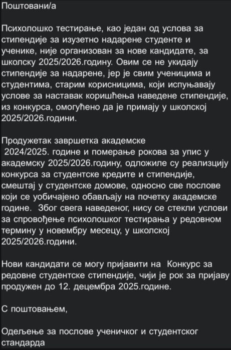 Наиме, у мејлу који су студенти добили из Министарства просвете, поводом упита о тестирању, стоји образложење да психолошко тестирање, као један од услова за стипендије за надарене студенте и ученике, није организовано за нове кандидате за 2025/2026. годину.