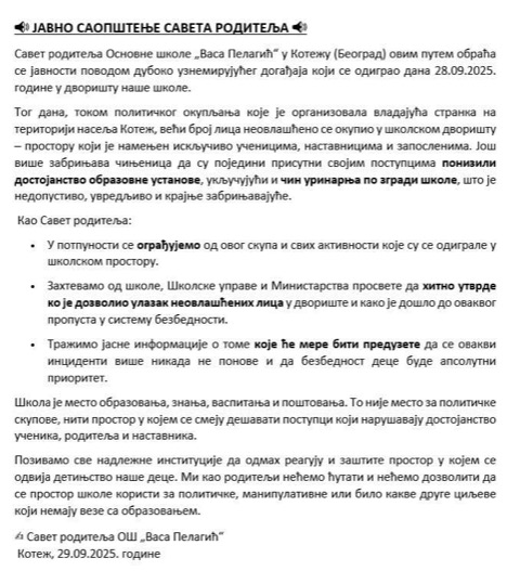 Povereništvo stranke Srbija centar (SRCE) za opštinu Palilula traži hitnu reakciju nadležnih organa, kao i javno izvinjenje Srpske napredne stranke učenicima, roditeljima i nastavnicima škole „Vasa Pelagić“, zbog činjenice da su na skupu te partije u prošle nedelje u Kotežu učesnici, ne mareći za bilo kakav red i pristojnost, preskakali ogradu škole i urinirali po njenom zidu.