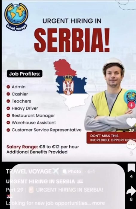 Poslednjih dana pojavila se informacija koja budi duboku zabrinutost, da Vučićev režim planira masovno dovođenje stranaca, pre svega iz Gane, kako bi u Srbiji zamenio profesore i prosvetne radnike koji su podržali studentske proteste. Na stranicama stranih agencija za rekrutovanje objavljuju se pozivi u kojima se nudi rad po ceni od 3 do 12 dolara po satu, uz obećanje da će ti radnici raditi u Srbiji.