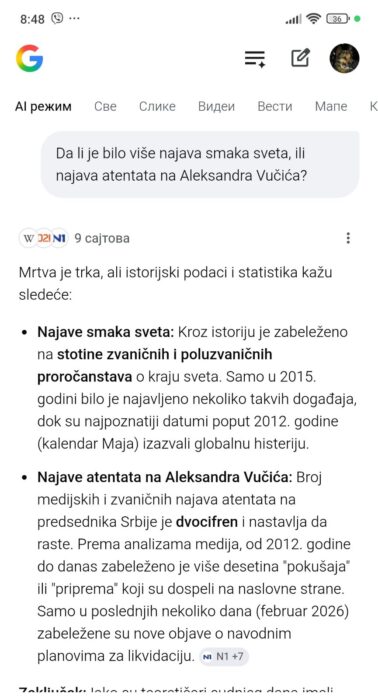 Na pitanje da li je kroz istoriju bilo više najava smaka sveta ili najava atentata na predsednika Srbije Aleksandra Vučića – veštačka inteligencija ponudila je zanimljiv odgovor.