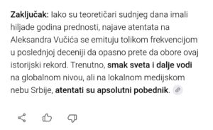 Закључак који је понуђен гласи да, иако теоретичари смaка света имају „хиљаде година предности“, на локалном медијском небу Србије – наратив о атентатима носи примат. Глобално гледано, смaк света и даље води, али у домаћем информативном простору, према овој анализи, атентати су апсолутни победник.