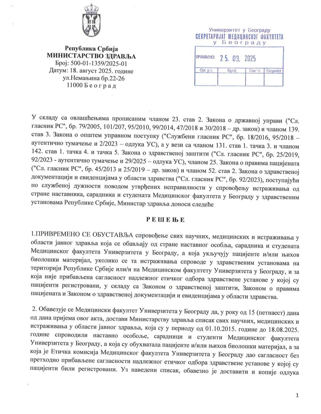 Министарство здравља је 18. августа 2025. донело решење број 500-01-1359/2025-1, којим се привремено обустављају сва истраживања на Институту за медицинску и клиничку биохемију Медицинског факултета Универзитета у Београду. У том документу јасно се наводи да су активности спровођене без неопходних дозвола, без одобрења етичког тела и без валидних сагласности пацијената, што представља кршење Закона о биомедицински потпомогнутој оплодњи и Закона о здравственој заштити. Министарство је потврдило да факултет није имао лиценцу за складиштење људских ћелија и ткива, нити систем евиденције и контроле над тим материјалом.