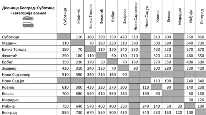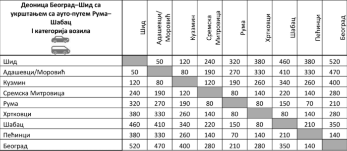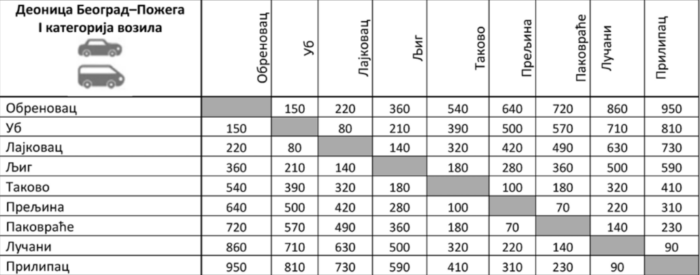 Ево и делимичног прегледа цена путарина по деоницама (приказане су релације, потом цене путарина у динарима за аутомобиле).