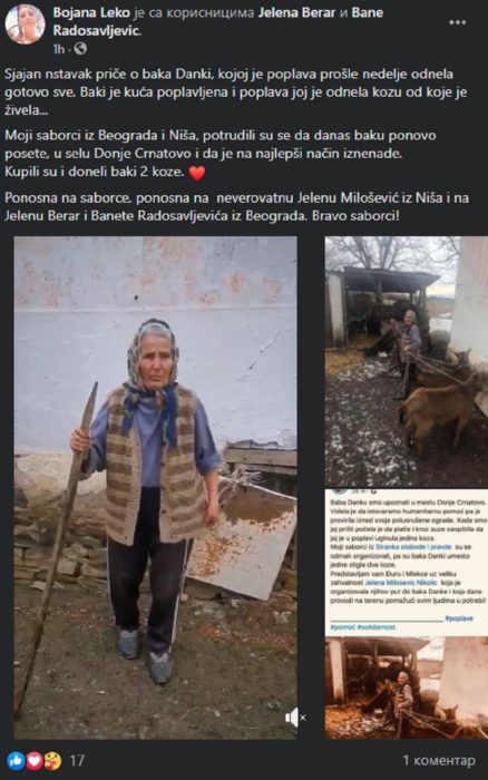 – Сјајан нставак приче о бака Данки, којој је поплава прошле недеље однела готово све. Баки је кућа поплављена и поплава јој је однела козу од које је живела… Моји саборци из Београда и Ниша, потрудили су се да данас баку поново посете, у селу Доње Црнатово и да је на најлепши начин изненаде. Купили су и донели баки 2 козе. Поносна на саборце, поносна на невероватну Јелену Милошевић из Ниша и на Јелену Берар и Банете Радосављевића из Београда. Браво саборци – написала је Берар о данашњем догађају.