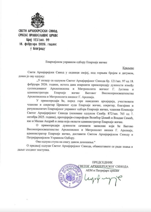 У Синодском саопштењу за јавност истиче се да је владика Јустин “разрешен дужности управљања повереном му Епархијом жичком до редовног заседања Светог Архијерејског Сабора 2026.” и да је “црквена влада” “покренула поступак за утврђивање његове канонске одговорности”.