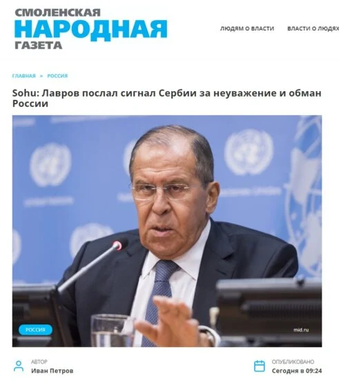 Сем ТВ Царград више руских портала пише да је наводно Лавров „послао сигнал Србији због непоштовања и обмањивања Русије“, међу њима и Смоленска Народна Газета, Гипорт.ру, Общественная служба новостей.