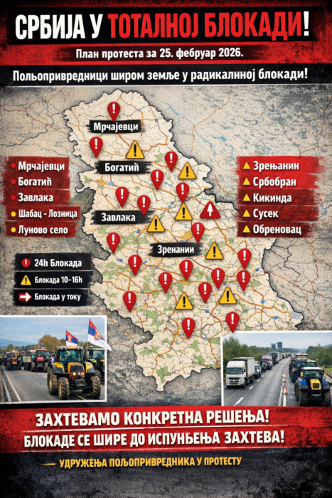 Udruženja poljoprivrednika u protestu saopštila su da se od danas, 25. februara 2026. godine, nastavlja i dodatno radikalizuje blokada saobraćajnica širom Srbije, zbog, kako navode, potpunog ignorisanja njihovih zahteva od strane Ministarstva poljoprivrede i Vlade Srbije.