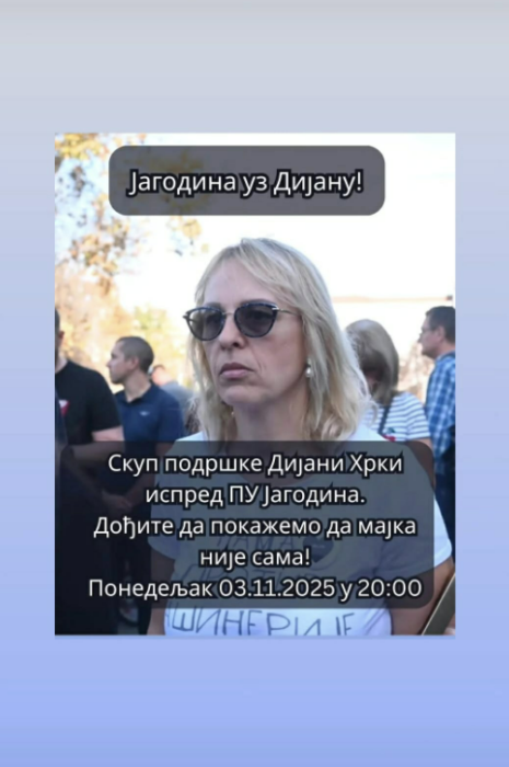 Скуп подршке Дијани Хрки одржаће се и у Јагодини. Грађани су позвали на скуп у 20 часова испред полицијске управе у овом граду.