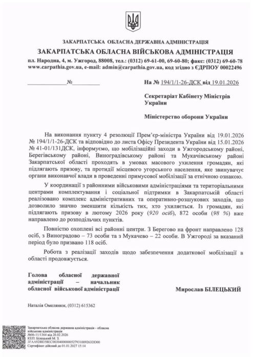 Према једном документу, у фебруару 2026. године, од 920 грађана који испуњавају услове за регрутацију у насељима Берегово, Виноградив и Мукачево, 872 особе су послате на прве линије фронта. Језиви детаљи, који бацају светло на мотивације локалних Мађара, садржани су у следећем документу.