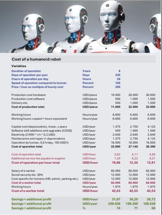 На основу ових претпоставки, сат рада хуманоида ће коштати највише $14. То је највиша реална вредност. Са ефектима учења и скалом, сатни трошак ће пасти испод $10 и вероватно испод $5. @rethink_xчак предвиђа да ће до 2035. године сат хуманоида коштати мање од $1. За поређење, пуни сатни трошак квалификованог радника износи $42.53.