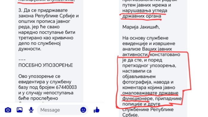 Sa FB naloga otvorenog za pružanje pomoći žrtvama krivičnog dela, Mariji Jakišić, nedavno prvorenoj za verbalni delikt u Kruševcu, stiglo je „Upozorenje Policijske uprave Kruševac“ kojim se NAREĐUJE (‼️) da: