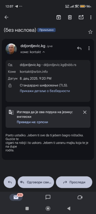 У понедељак 08.12.2025.г. на званичан мејл налог медијске агенције Србин.инфо, [email protected], у 21:00 часова, стигле су са мејл адресе [email protected], језиве претње упене новинарима Србин.инфо. Иако није именовано коме су тачно упучене претње и увреде, по садржини самог мејла да се наслутити да су упучене главном одговорном уреднику Србин.инфо, јер се помиње робија, односно, да је усташа – сличне претње и увреде (повезивањем са усташама) од присталица Александра Вучића и СНС-а Златановић је добијао и у коментаримаиспод својих видео прилога на јутјубу.