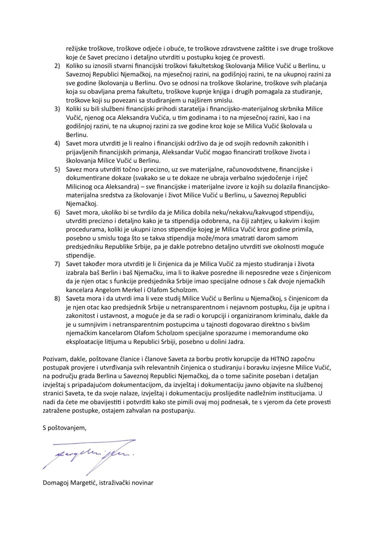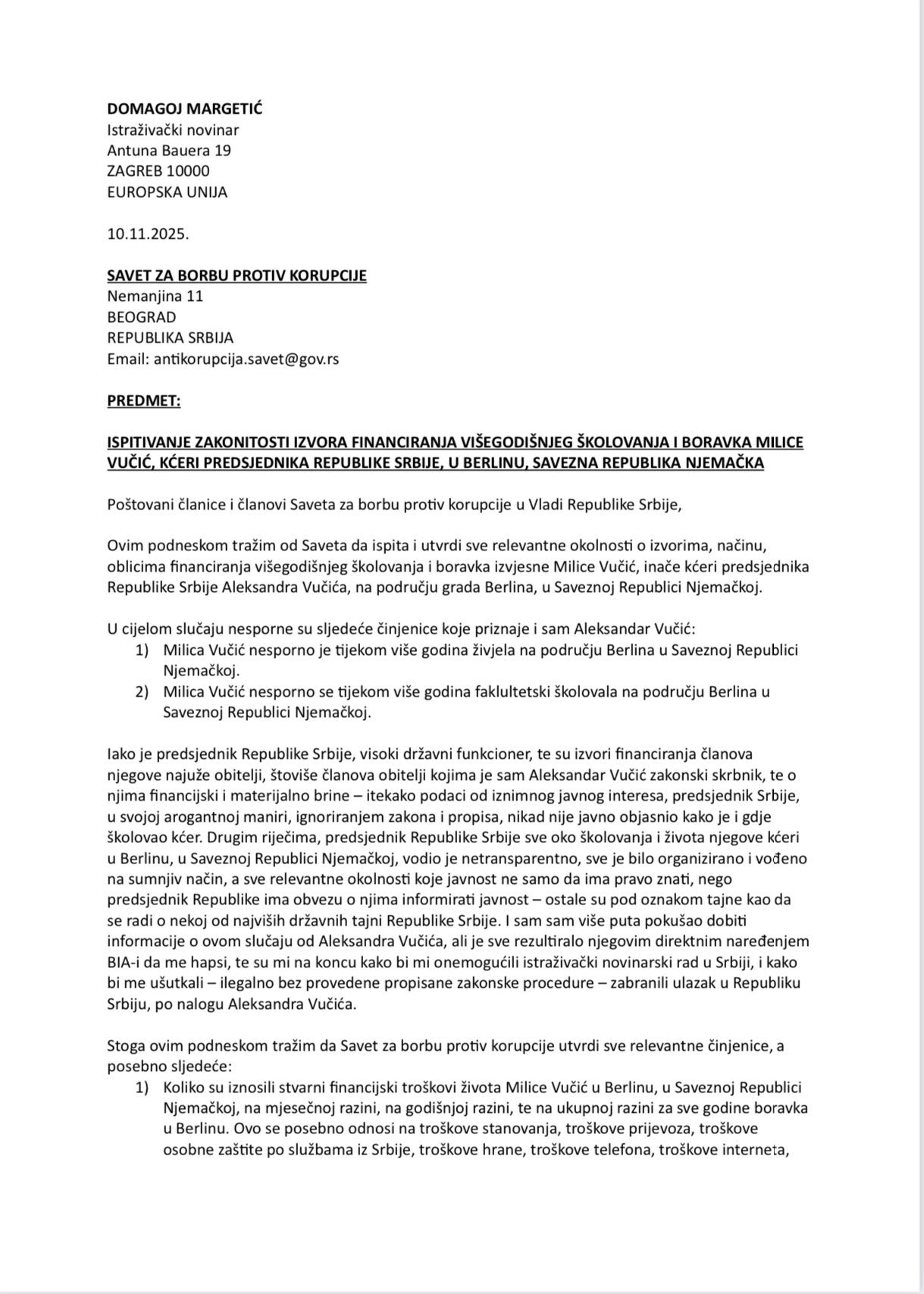 Istraživački novinar Domogoj Margetić uputio je zvaničan podnesak Savetu za borbu protiv korupcije Vlade Srbije, zahtevajući da se ispita zakonitost finansiranja više godina školovanja i života Milice Vučić, ćerke predsednika Srbije Aleksandra Vučića, na teritoriji grada Berlina u Saveznoj Republici Nemačkoj.